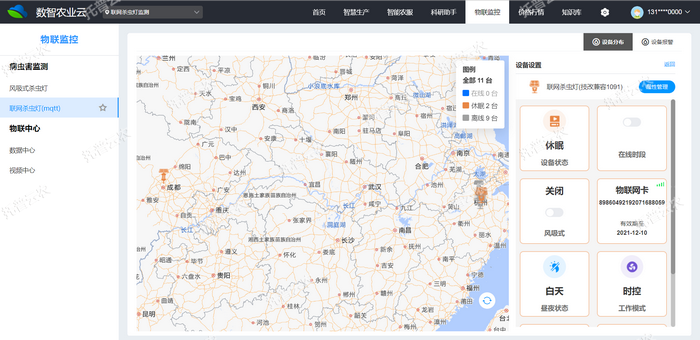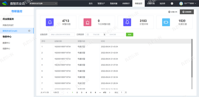 4、风吸式茶园杀虫灯支持手机App与Web端控制,具有丰富的状态信息展示,足不出户就可以了解一切,如地理位置、设备编号、基地名称、物联网卡卡号、剩余流量、卡有效期、GSM天线连接是否正常等故障报警信息。可远程控制、查看设备的当前工作状态、信号强度、电量使用等情况。